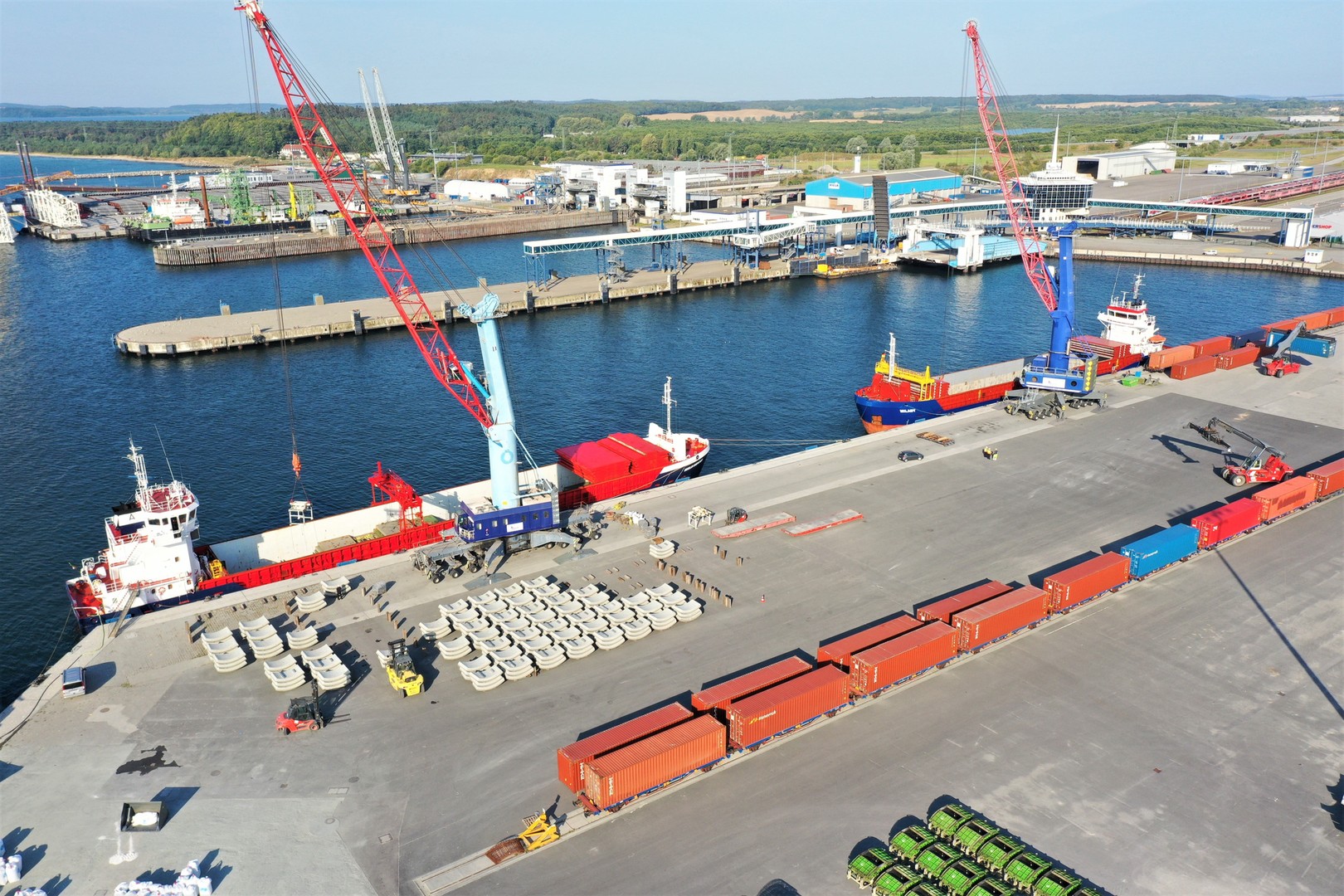 Unser Standort bietet auf 80 ha freie Flächen mit idealen Voraussetzungen für Industrie- und Anlagenbauer. Ein Teil der Flächen ist für Schwerlast ausgelegt, und auch für Transport und Handling schwerer und sperriger Teile ist vielfältiges Equipment vorhanden. Gerne unterstützen wir Sie auch mit unserer Expertise aus zahlreichen Großprojekten, wie dem Copenhagen Metro Tunnel. Dank unserer direkten Anbindung an den Mukran Port können Sie bei uns sämtliche Prozessschritte realisieren – von der Vor-, Zwischen- und Endmontage bis zum Verschiffen. Direkt von der Kaikante geht es bei uns los zu attraktiven Märkten, beispielsweise nach Skandinavien oder ins Baltikum.