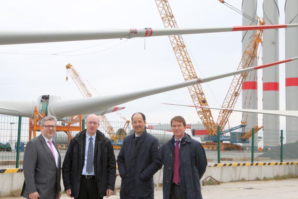 v.l.n.r.: Jürgen Blume (Geschäftsführer Iberdrola Deutschland), Volker Huber (Goldbeck Nordost GmbH Geschäftsstellenleiter), Tanis Rey-Baltar (Gesamtprojektleiter Wikinger), Christian Pegel (Minister für Energie, Infrastruktur und Digitalisierung), Javier Garcia (Projektdirektor Wikinger).