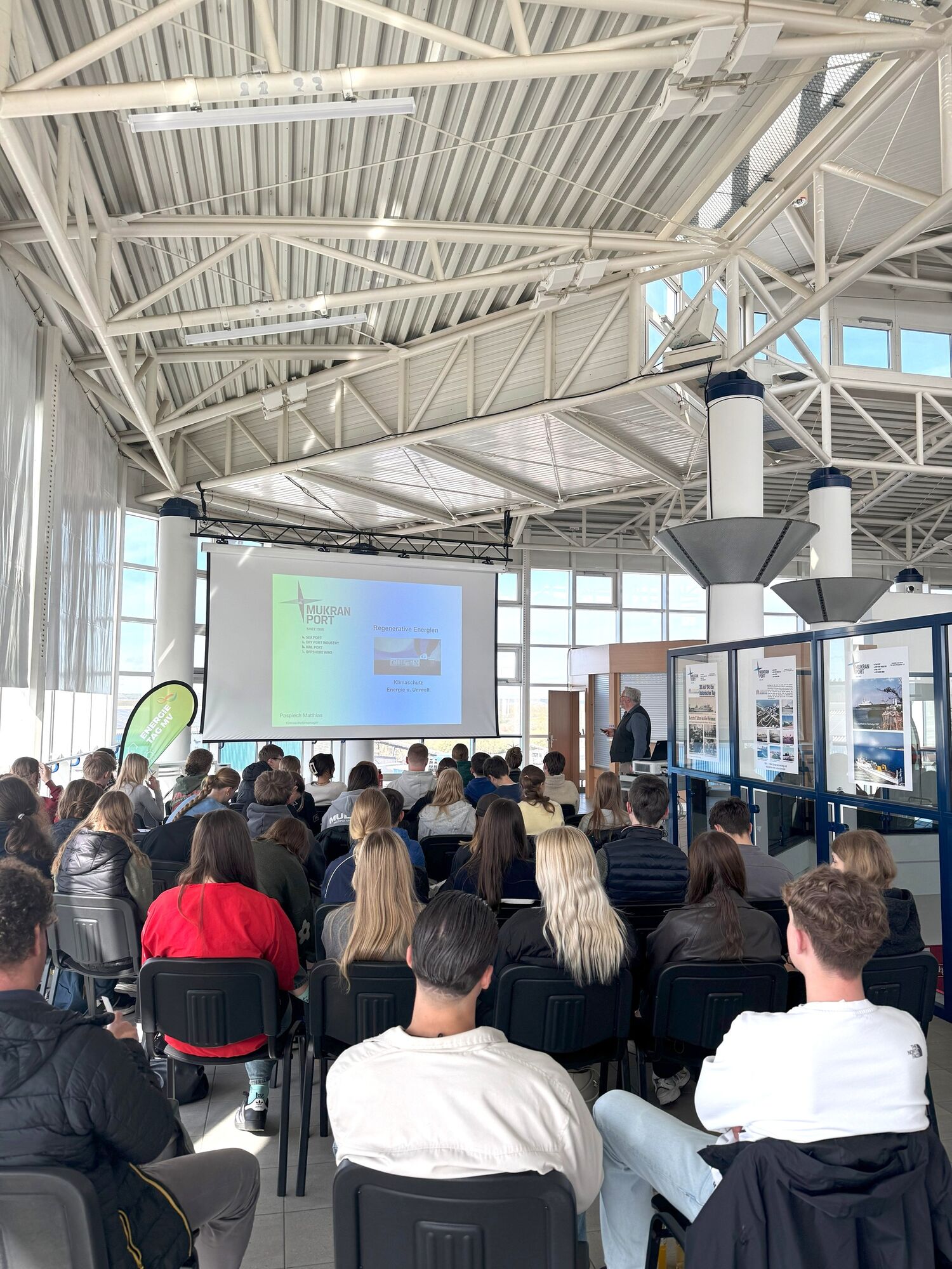 Bereits am Freitag hatten wir ca. 50 Schüler der CJD Christophorusschule Rügen bei uns zu Gast. Matthias Pospiech, Klimamanager und Organisator der Veranstaltung in unserem Hafen, informierte in seiner Auftaktpräsentation über die Energieerzeugung und -nutzung im Mukran Port. Im Anschluss gab Levin Buss von der Wärmeversorgung Rügen GmbH Einblicke in die aktuelle sowie zukünftige Energieversorgung der Stadt Sassnitz. Einen interaktiven Vortrag zur Offshore-Windindustrie inkl. Gruppenarbeit bot Peter Ziegler von der Iberdrola Renovables Deutschland GmbH. Auch für ausreichend Nervennahrung war gesorgt: Ein Food Truck mit Pulled Pork Burgern in unterschiedlichen Variationen sowie Süßkartoffel-Pommes stand im Hafen für die Schüler bereit.