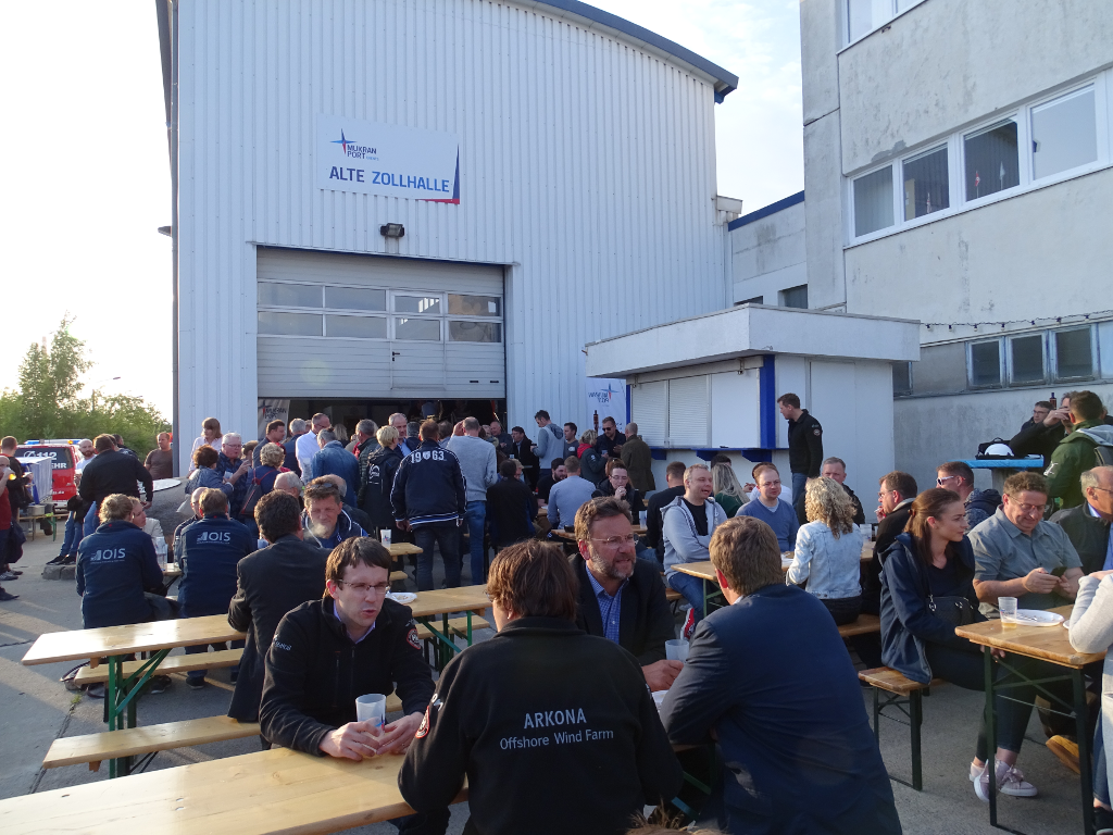 Sassnitz-Mukran, 18. Mai 2018 - Weit über 100 Gäste waren Mitte Mai im Mukran Port beim jährlichen „Offshore BBQ“ anwesend. Der Fokus des Networking-Events lag auf den bereits über den Hafen realisierten oder in Bau beziehungsweise Planung befindlichen Windparks, an denen viele der Besucher des Abends selbst aktiv mitwirken. Im Rahmen der Veranstaltung wurden auch in diesem Jahr Unternehmen mit dem „Best-Practice-Offshore-Wind-2018“-Preis ausgezeichnet. Diesen erhielten in Form einer Messingglocke der Windkraftanlagenhersteller Adwen, der Kabelproduzent Nexans sowie Fred. Olsen, Betreiber von Installationsschiffen. Unterstützt von musikalischer Untermalung, für die unter anderem Sänger Rollo mit einer Überraschungsdarbietung seines von der Stromerzeugung auf See handelnden Songs „Mitten im Wind“ sorgte, unterhielten sich die Teilnehmer bei Grillfleisch und kühlen Getränken zu den neuesten Branchenentwicklungen.