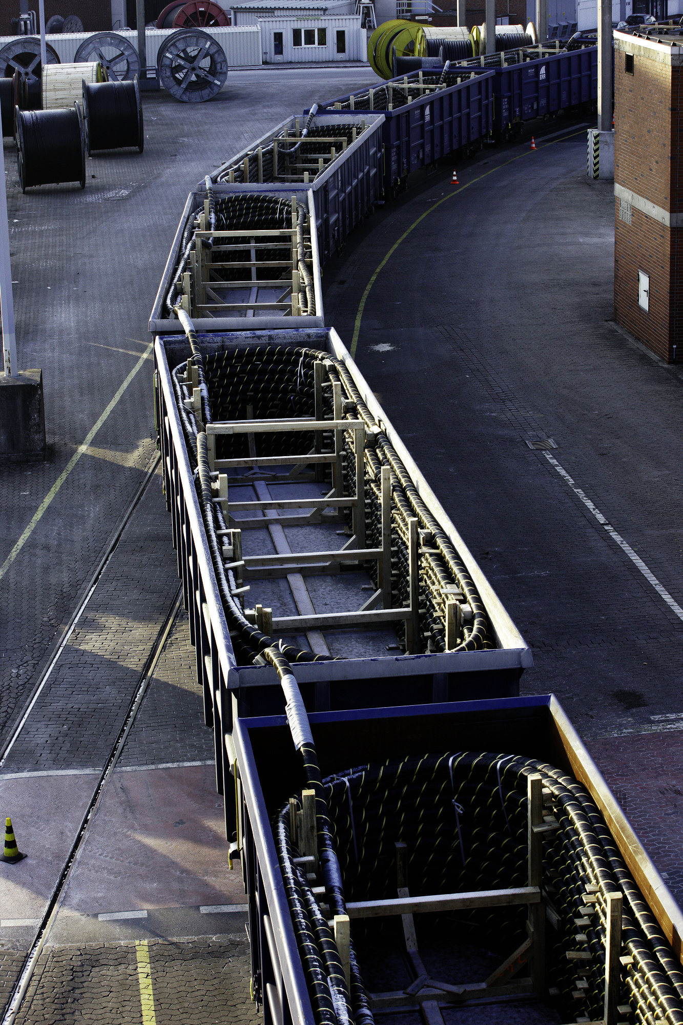 Sassnitz-Mukran, 28. September 2017 — Insgesamt 76 Kilometer Kabel für ein aktuelles Offshore-Windparkprojekt in der Ostsee sind auf dem Weg in den Mukran Port auf der Insel Rügen. Der erste von fünf Zügen mit Seekabeln von Nexans aus dem Werk Hannover hat heute den Hafen erreicht. Über das neue Gleis 66 werden die Kabel bis zur Kaikante gebracht und dort gelagert, bevor sie vom Verlegeschiff aufgenommen werden. Der Mukran Port ist ein wichtiger Umschlagplatz für die Offshore-Windindustrie und Projekte in der Ostsee.