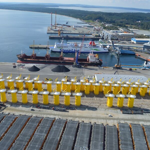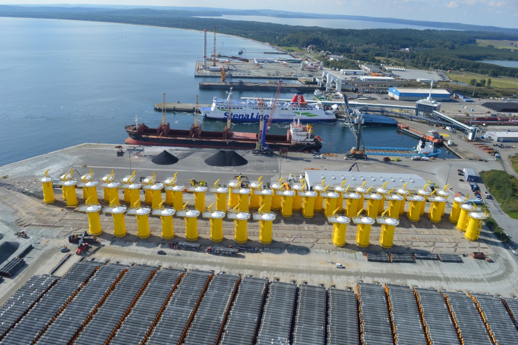 Sassnitz-Mukran, 27. September 2017 - Die Installation der letzten Windkraftanlagen (WEA) im Offshore-Windpark „Wikinger“ von Iberdrola steht vor ihrem Abschluss, da beginnt aus dem Mukran Port heraus bereits die Errichtung eines neuen Projektes. Der Energieversorger E.ON will bis 2019 vor Rügen den Windpark „Arkona“ mit seinen 60 Anlagen der Sechs-Megawatt-Klasse realisieren. 385 Megawatt soll das 1,2 Milliarden Euro teure Vorhaben, dessen Start in einer Feierstunde im Hafen offiziell eingeläutet wurde, dann an Stromleistung erbringen. Die dafür benötigten WEA-Komponenten, die zum Teil schon seit Sommer dieses Jahres im Hafengelände zwischenlagern, werden über den Mukran Port und dessen Kaikanten künftig in Richtung Baufeld verschifft.