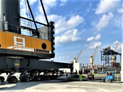 Sassnitz - Mukran, 20. Mai 2022 — Zur Erhöhung der Leistungsfähigkeit und Schaffung von noch mehr Flexibilität wurden zwei Hafenmobilkräne von Mukran Port Terminals innerhalb des Hafengeländes umgesetzt. Ein Mobilkran wurde vom Süd- in den Nordhafen versetzt und ein technisch anderer Kran vom Nord- in den Südhafen.