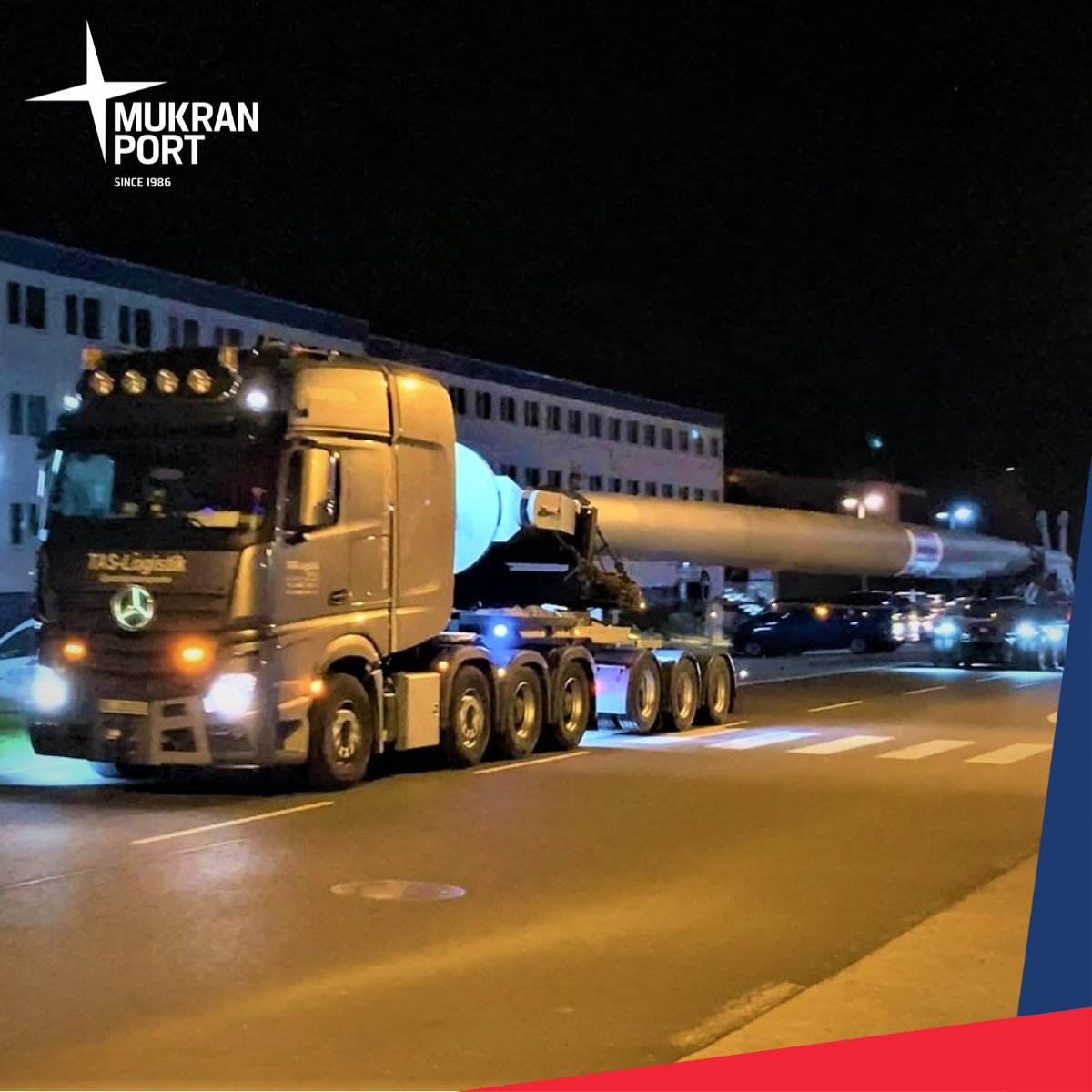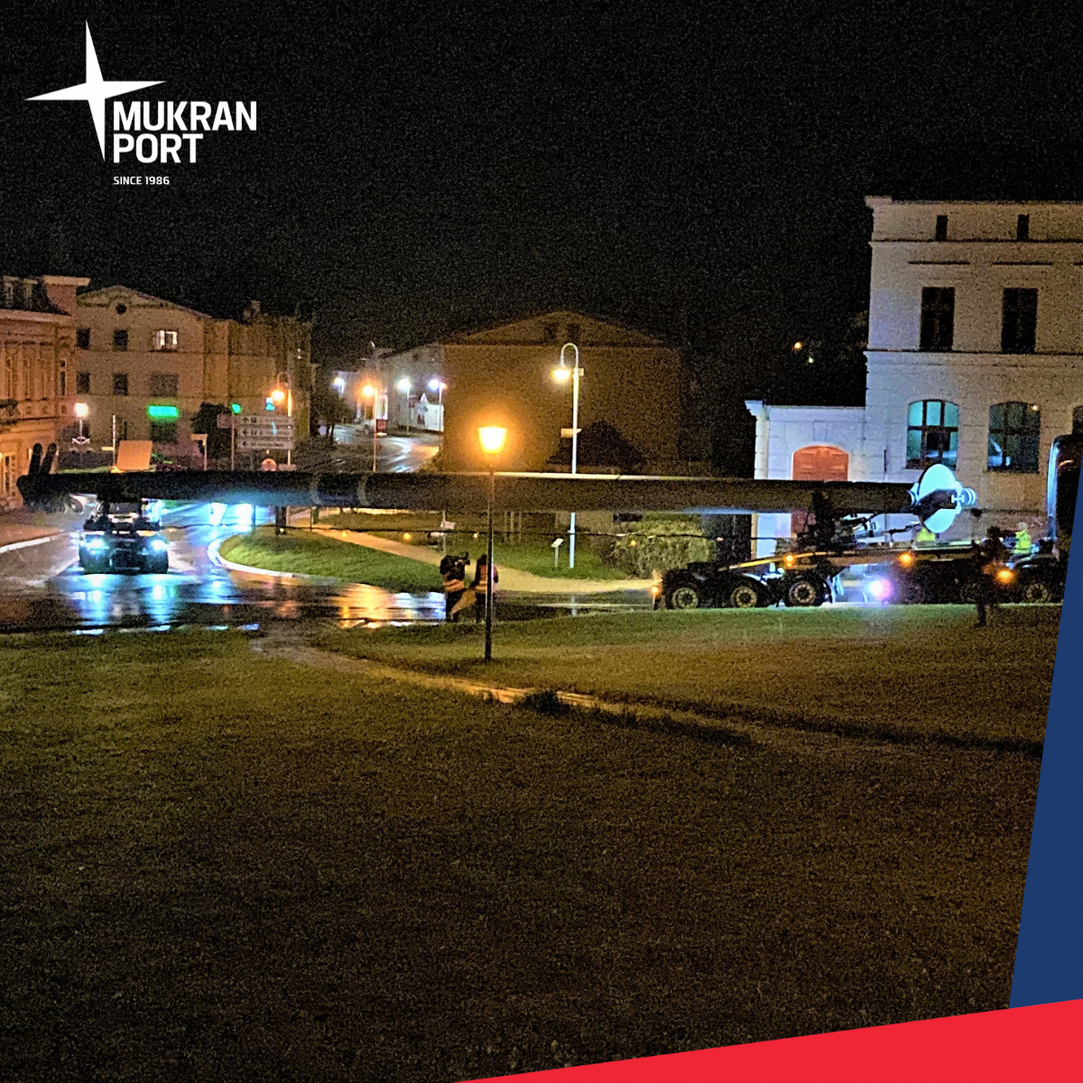 Sassnitz - Mukran, 11. Oktober 2022 — In der vergangenen Nacht wurde der von flz in Lauterbach gebaute Mast mit 42 Metern Länge ab Mukran Port als überlanger Sondertransport für die Montage des „Skywalk“ am Königsstuhl abtransportiert.