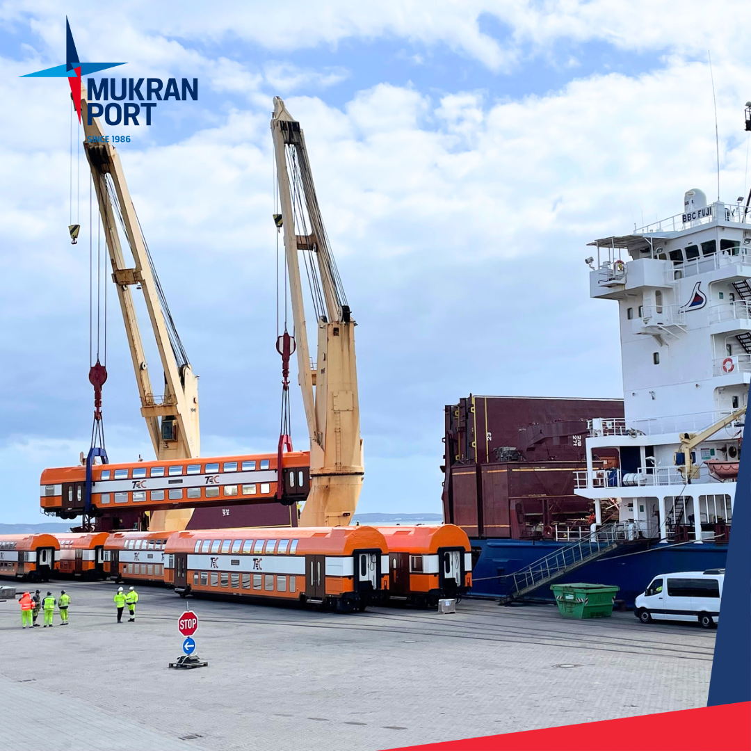 Sassnitz-Mukran, 27. April 2023 - In Mukran Port hat ein heavy Lift Schiff mit bordeigenen Kränen, Doppelstockwagen mit der Unterstützung von Mukran Port Terminals GmbH direkt vom Gleis in den Schiffsraum geladen. Die Fahrzeuge sind Teil eines Projektes der Baltic Port Services GmbH im Auftrag des TRC Tansania/Afrika.