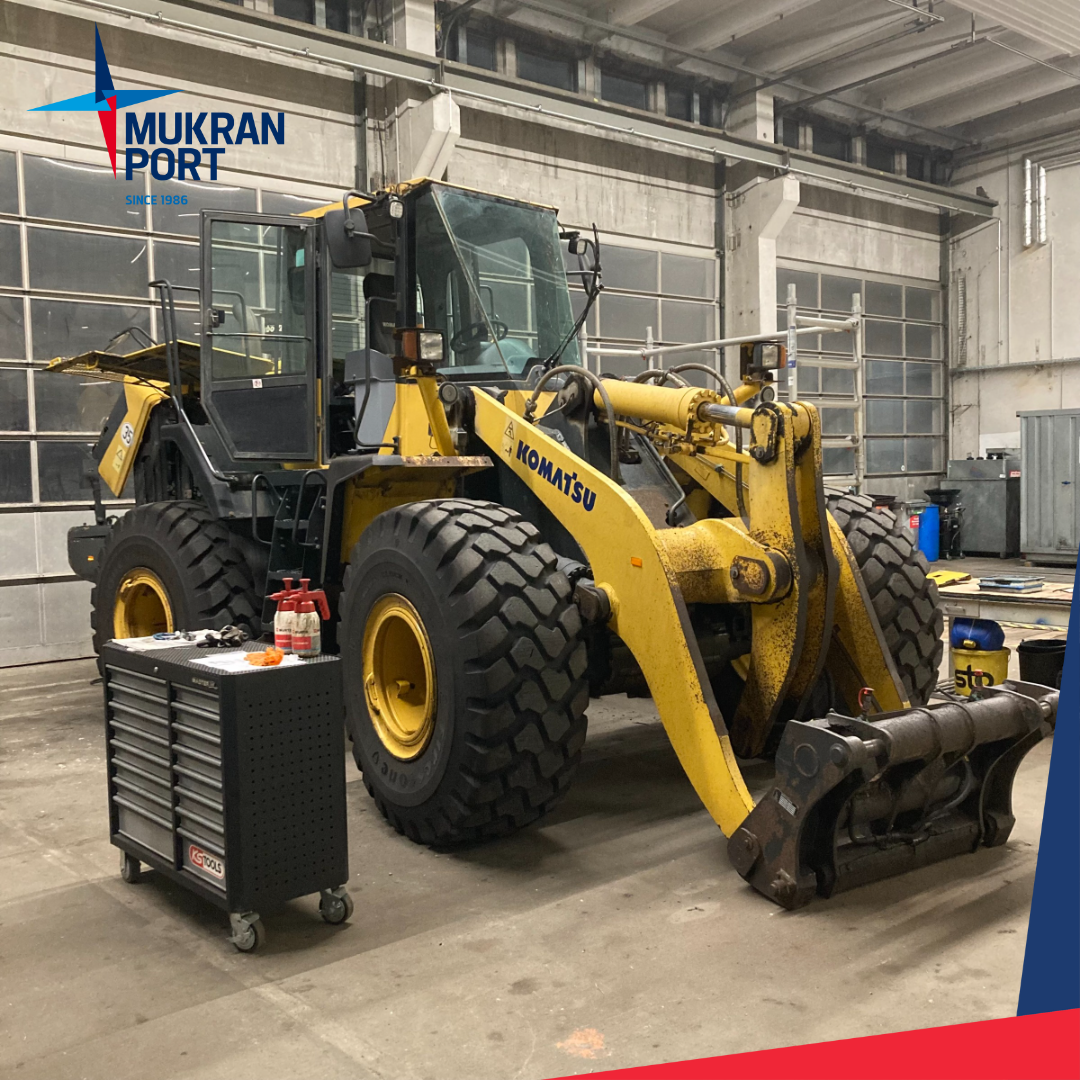 Sassnitz - Mukran, 05. Dezember 2022 – Until Friday last week, the KOMATSU wheel loader was a guest in the workshop of Mukran Port Terminals. In addition to replacing the defective windscreen, maintenance work wass also carried out, such as checking and replacing the air filter, which has to be checked regulary due to the dusty work at the terminal. The workshop team has worked through all the important points so the wheel loader returns to the terminal today.