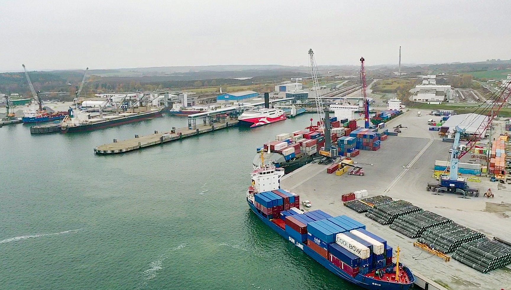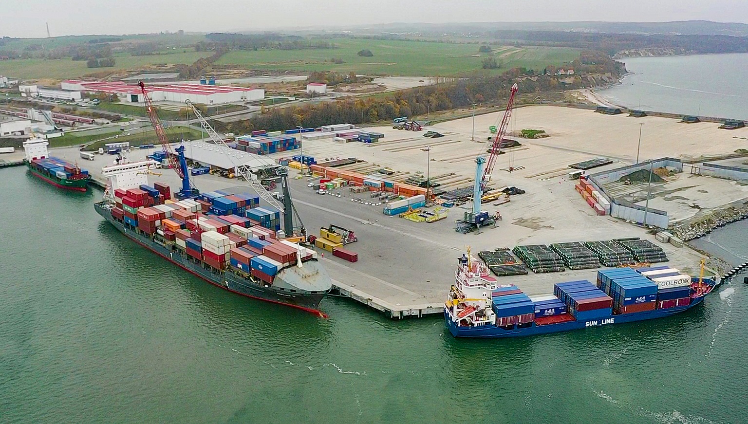 Sassnitz-Mukran, 18.11.2021 — At the beginning of the week, within 24 hours, four container ships moored at the Mukran Port Terminals to handle and discharge cargo. The ships are operating on the New Silk Road between China and Europe. They use Mukran Port as a central hub for traffic to and from Great Britain, Sweden and Central Europe.