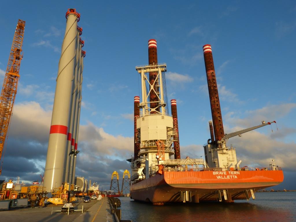 Sassnitz-Mukran, January 5, 2017 – The installation vessel "Brave Tern" of the offshore wind project „Wikinger“ berthed at Mukran Port and jacked-up for the load-out of the components.
