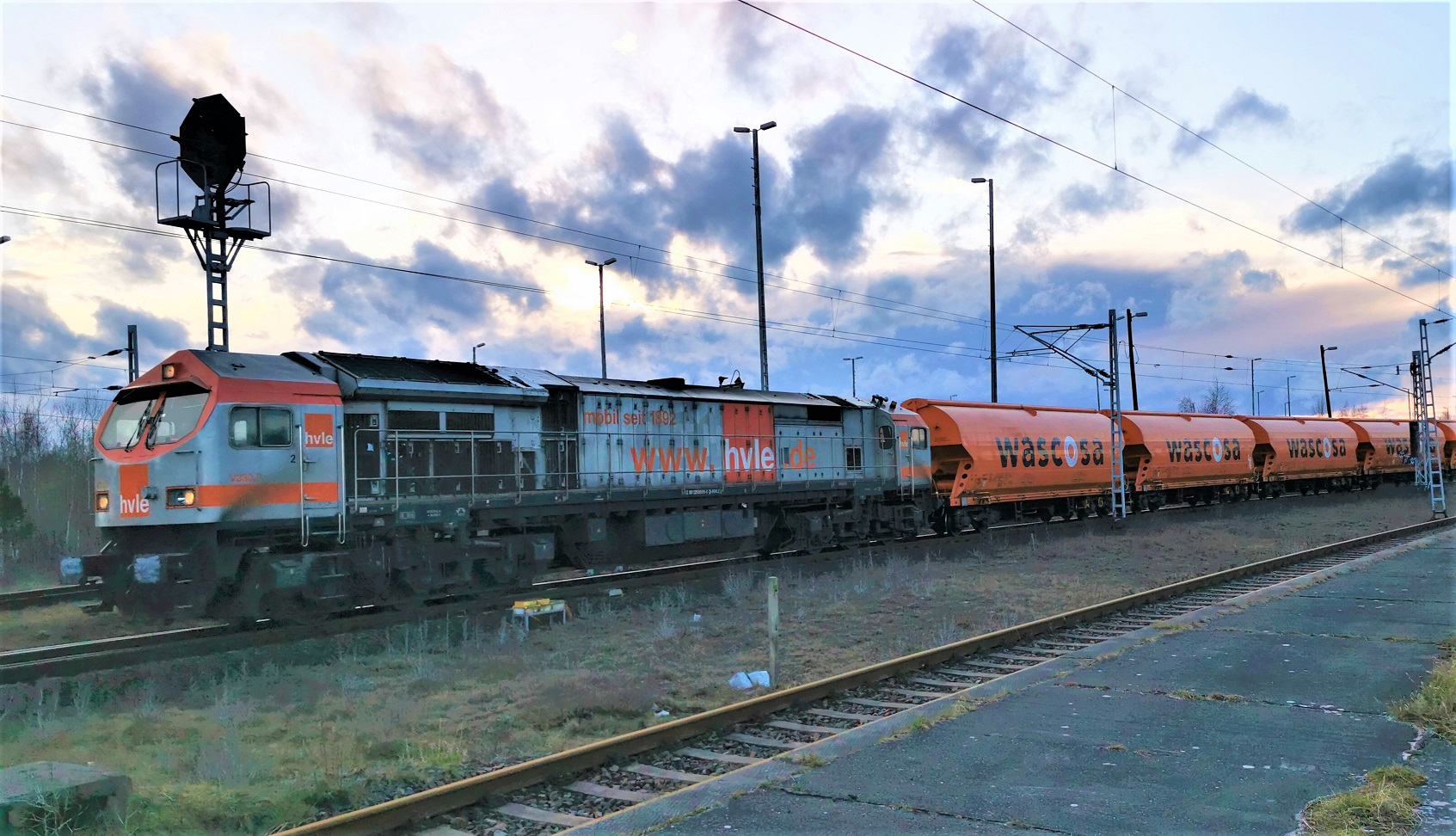 Sassnitz-Mukran, 7. April 2022 — At the end of March and the beginning of April, a grain train arrives Mukran almost daily. Baltic Port Rail is shunting the waggons to the grain terminal for unloading.