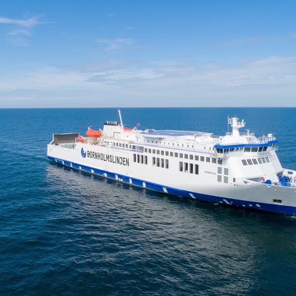 Sassnitz-Mukran, September 07 , 2018 - The danish shipping company Molslinjen took over the only direct ferry connection between Mukran and Roenne on 01 September 2018. This was the first change of operator on the route after 150 years. The shipping company Molslinjen offers the connection under the name Bornholmslinjen. The traditional area of passenger shipping in Mukran is to regain importance in the future and boost tourism on both islands. To illustrate these goals, the shipping company had a new ship built especially for this route. The 158 meter long "Hammershus" offers space for 720 passengers and thus twice as many as was possible with the old operator, the passenger car capacity also increases. "In recent years, we have proven that tourism and an industrial and business location are not mutually exclusive. Thanks to our favourable geographical location and the existing infrastructure, large passenger ships can also call at the port in addition to huge installation vessels for the construction of wind turbines," emphasised Thomas Langlotz, Commercial Director of Mukran Port. In addition to year-round ferry traffic, 5 times a week in summer and 3 times a week in winter, ticket prices also fall significantly.
