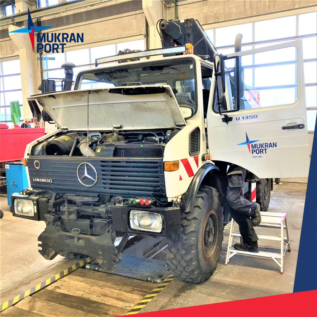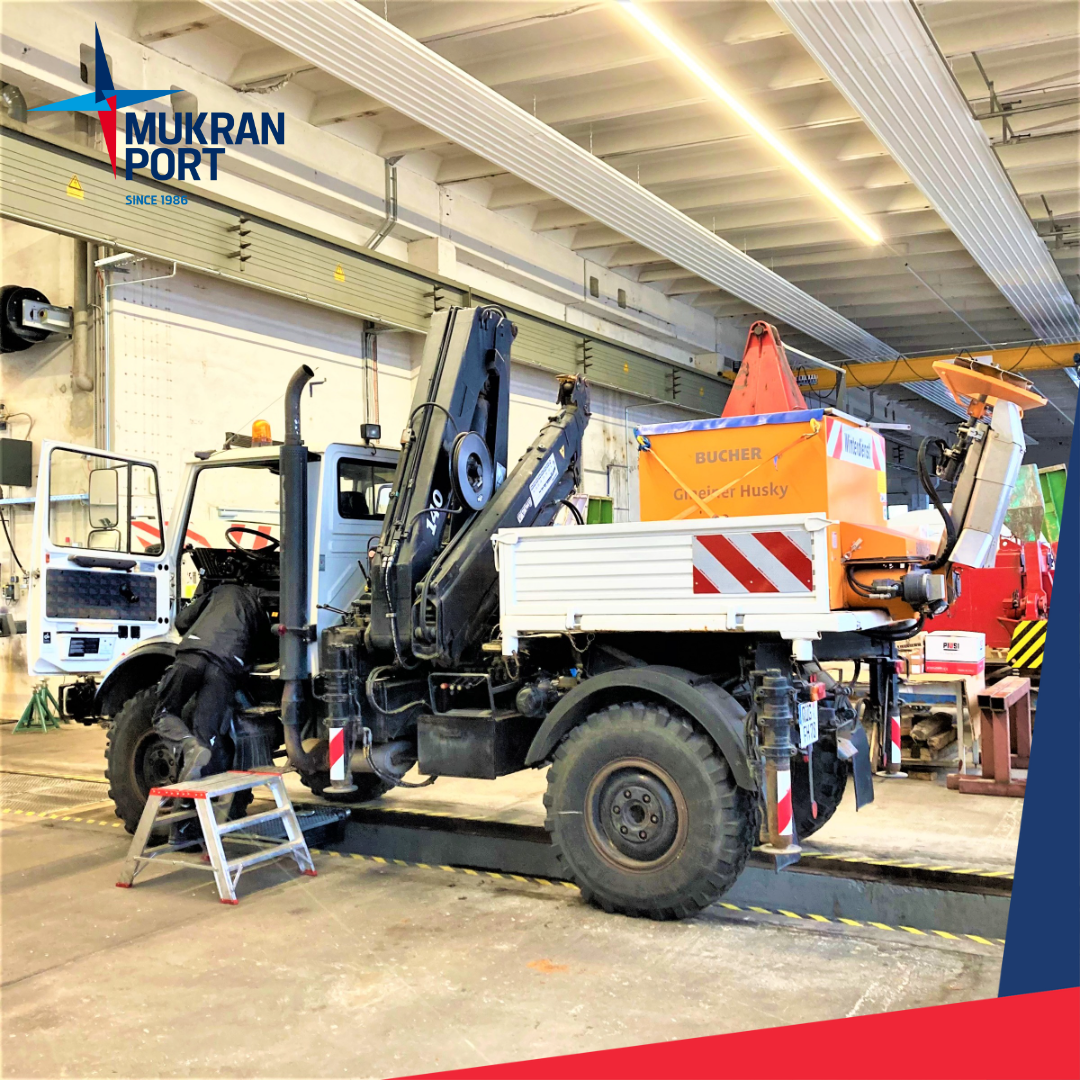Sassnitz-Mukran, 14. November 2022 - Mukran Port is prepared for winter. In the MPT workshop this week, the Unimog is being prepared for its winter deployment and technically upgraded to ensure traffic safety in the port with a snow plough and salt spreader.