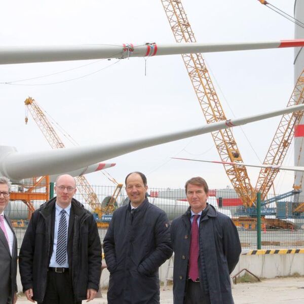 v.l.n.r.: Jürgen Blume (Geschäftsführer Iberdrola Deutschland), Volker Huber (Goldbeck Nordost GmbH Geschäftsstellenleiter), Tanis Rey-Baltar (Gesamtprojektleiter Wikinger), Christian Pegel (Minister für Energie, Infrastruktur und Digitalisierung), Javier Garcia (Projektdirektor Wikinger).