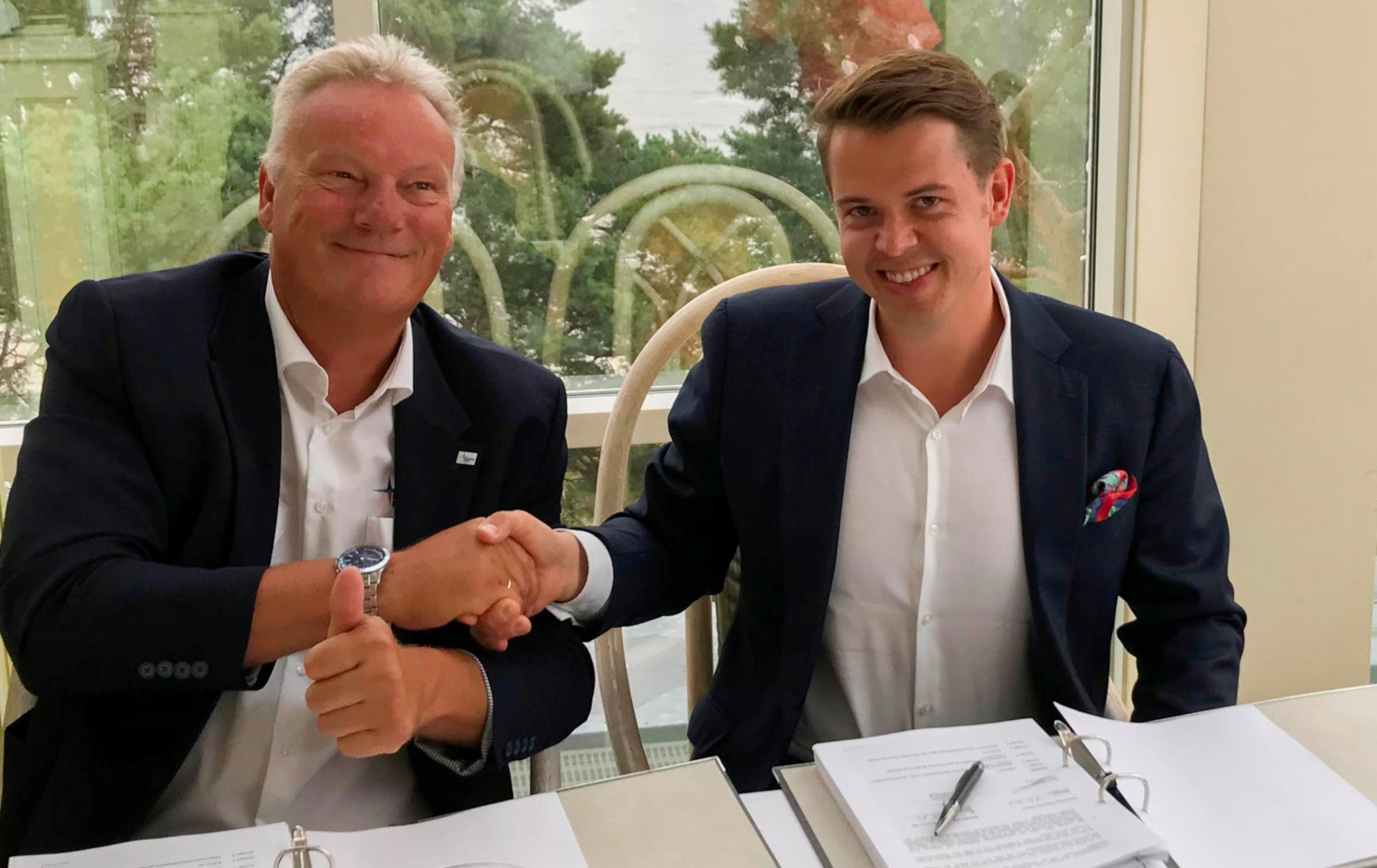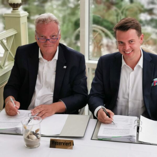 Harm Sievers (links), Geschäftsführer Mukran Port, und Thomas Hoyer (rechts), geschäftsführender Gesellschafter der Wilhelm Hoyer GmbH & Co. KG., unterzeichnen die Verträge für die Errichtung der neuen Bunkerstation im Mukran Port.