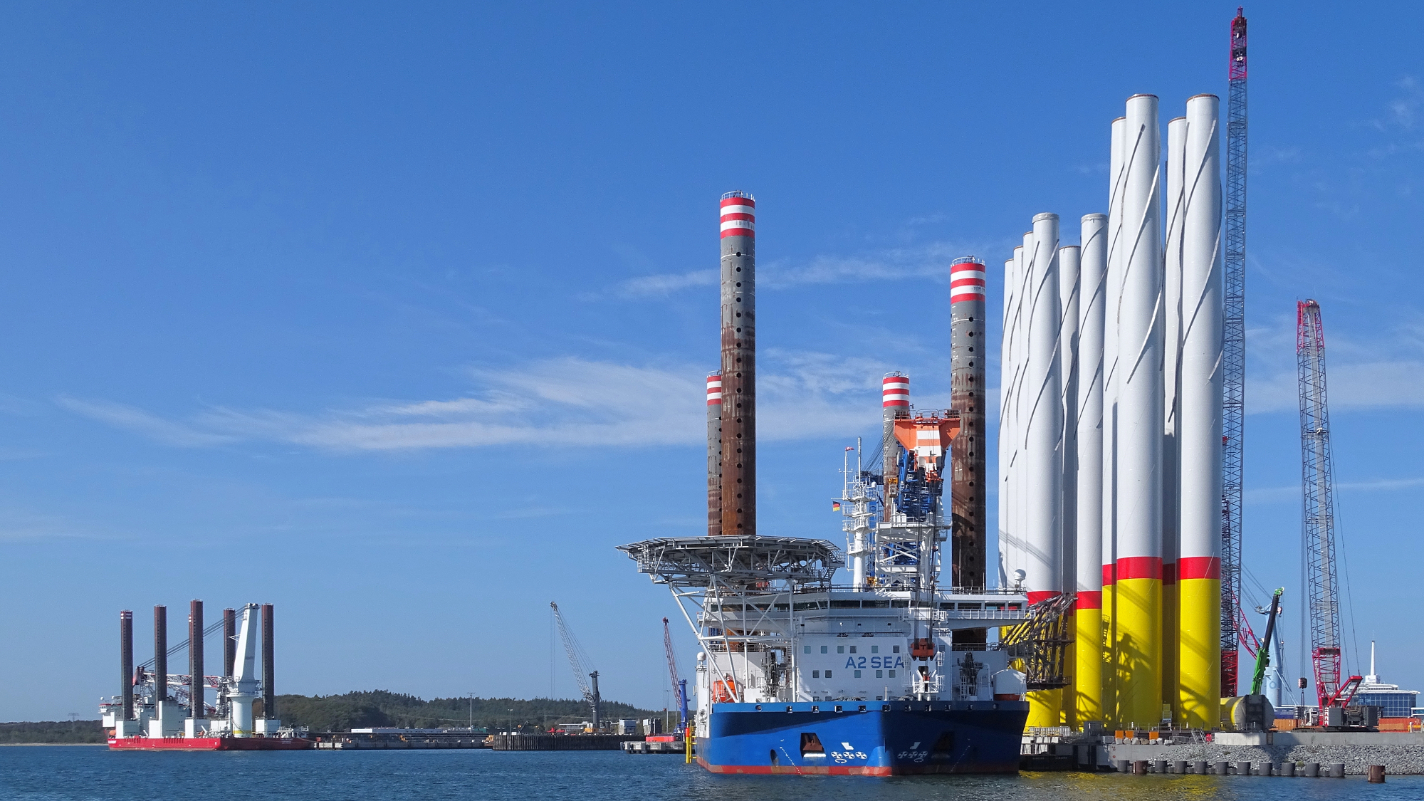 Sassnitz-Mukran, 19. September 2018 - Seltenes Bild im Mukran Port: Nachdem das Installationsschiff „Taillevent“ bereits am Montag im Mukran Port festmachte, lief heute auch die „Sea Challenger“ den Hafen von Mukran an. Damit ergibt sich ein besonderes und weithin sichtbares Bild von zwei kollossalen Jack-Up Schiffen in der Prorer Wiek. Während die „Sea Challenger“ weiterhin für die Installation der Windkraftanlagen des Windparks "Arkona Becken Südost" im Einsatz ist, liegt die „Taillevent“ am Terminal Süd, nachdem sie Arbeiten in der Ostsee vor Rügen verrichtete.