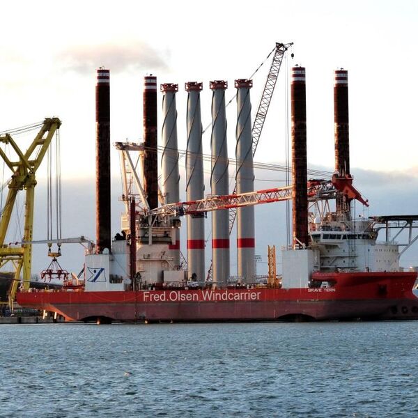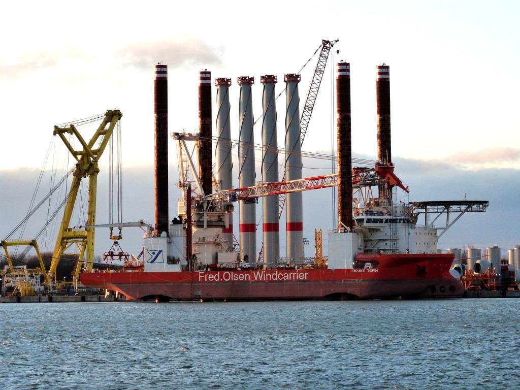 Sassnitz-Mukran, January 5, 2017 – The installation vessel "Brave Tern" of the offshore wind project „Wikinger“ berthed at Mukran Port and jacked-up for the load-out of the components.
