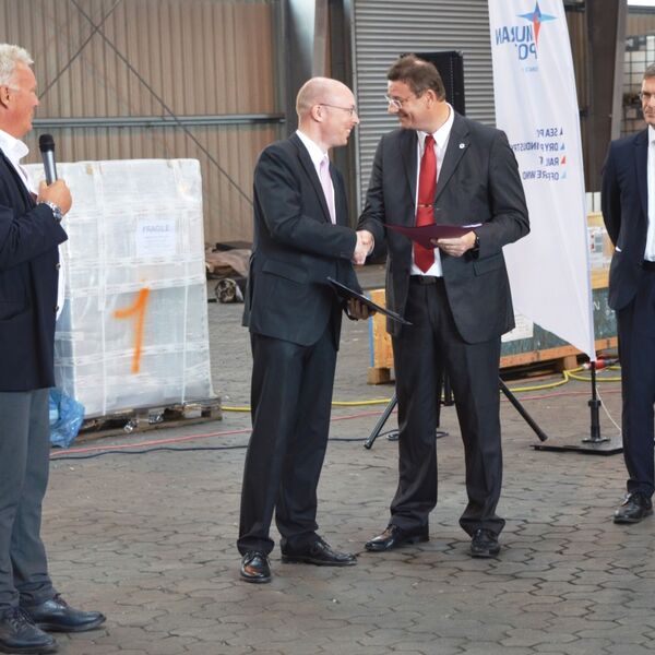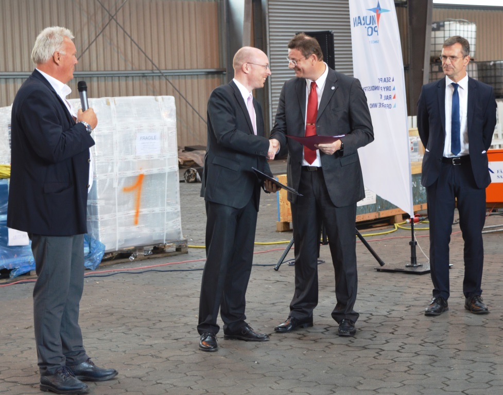 Sassnitz-Mukran, July 31, 2017 - Nearly four and a half million euros are available in the Mukran Port for construction of a new wavebreaker and extension of the existing quarry stone mole. In the middle of last week, Christian Pegel, the minister responsible for infrastructural measures in Mecklenburg-Western Pomerania, handed over the grant containing state and federal funds of almost four million euros, being the main part of the investment, to those responsible in Fährhafen Sassnitz GmbH. The money will also be used for the installation of dolphins, which serve as a mark for the shipping traffic in the port basin.