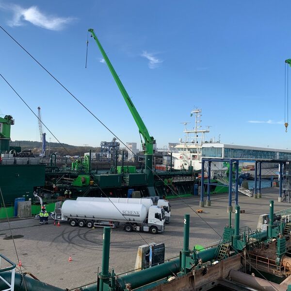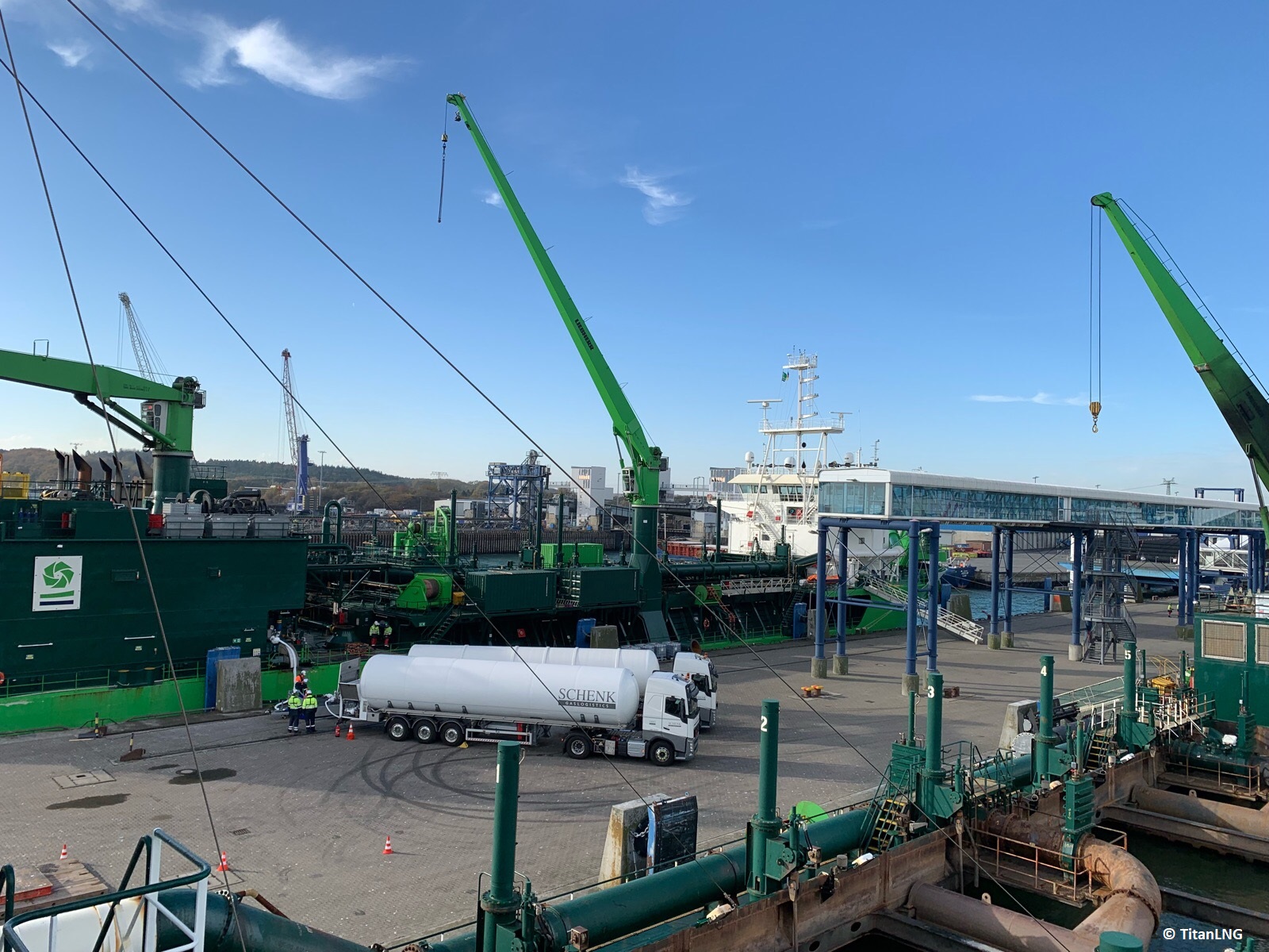 The article of the Titan LNG can be found here: http://titan-lng.com/en/first-delivery-by-titan-lng-in-german-port-of-mukran-demes-dredger-scheldt-river-was-refuelled-from-7-lng-trucks/