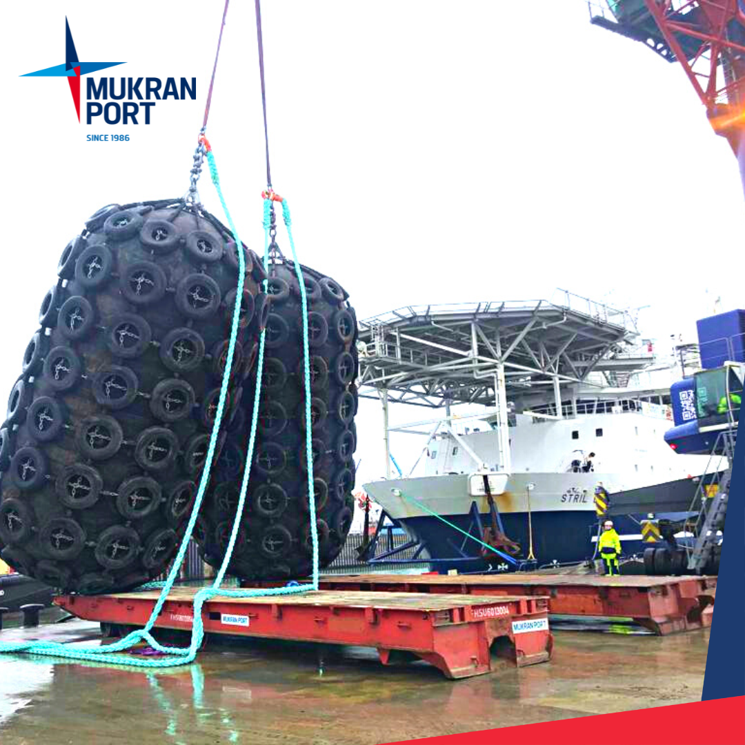 Sassnitz-Mukran, 26. May 2023 - Mukran Port Terminals (MPT) offers numerous services for companies in the offshore sector. For ship-to-ship transhipments, oversized fenders are stored on MPT's premises and made available to the tug after being commissioned by the customer. After completion of the operation, the fenders will be brought back to the port and stored again by MPT.