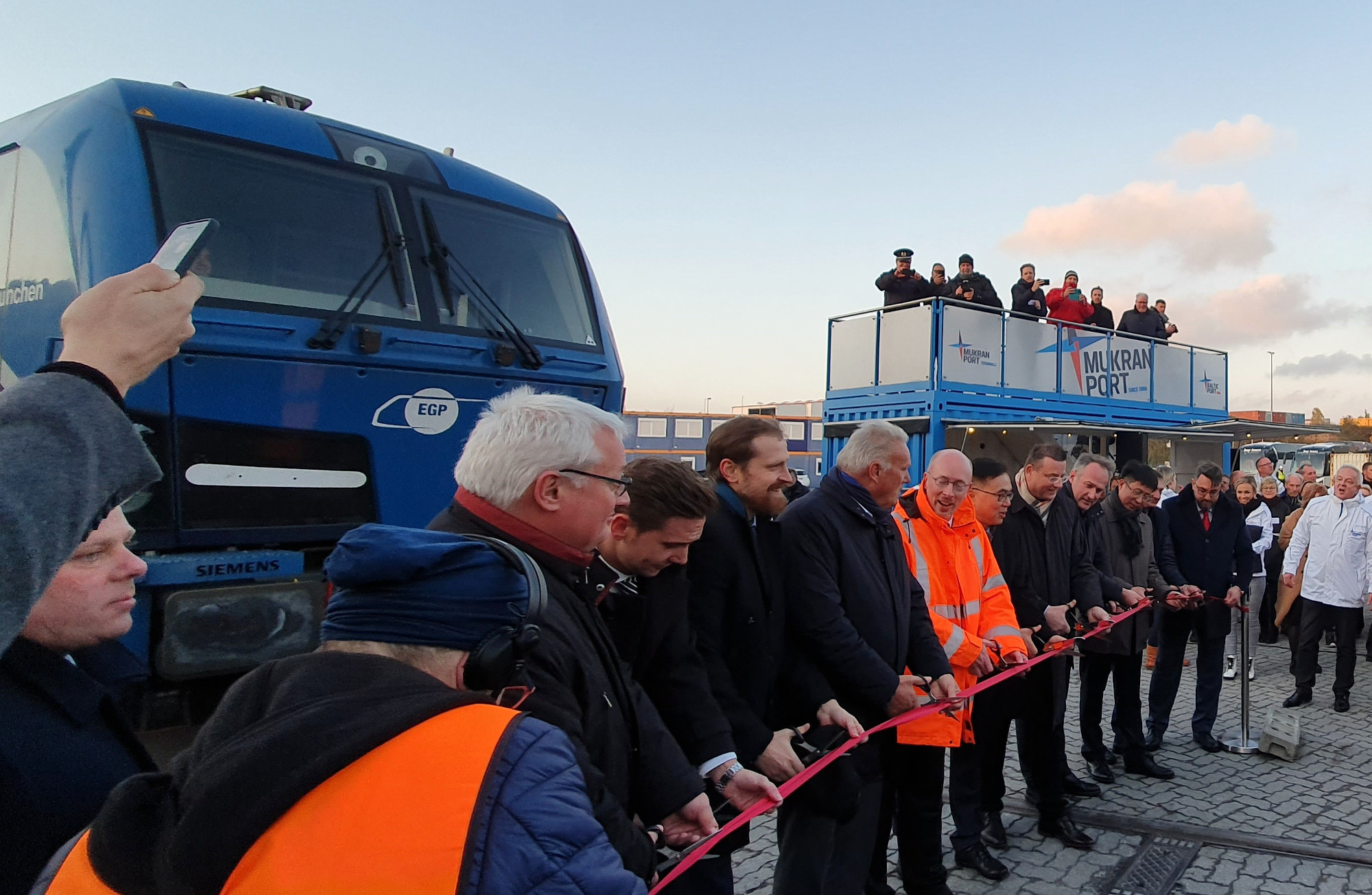 Sassnitz-Mukran, November 19, 2019 - The first direct freight train connection between China and Mecklenburg-Western Pomerania arrived at Mukran Port on Tuesday 12th November. The train going east started its journey with 48 Containers. The 640m long freight train going west started its 10.000 km long trip from Xi´an in China via Kazakhstan, Russia and Belarus to Baltijsk in Kaliningrad loaded with 41 Containers, where they were loaded onto a short sea carrier. Arriving at Mukran Port the team of Mukran Port Terminals GmbH & Co. KG handled the cargo and lifted the containers back onto a train.This new route of the “Silk Road Initiative” was ceremonially inaugurated by all parties and persons involved.