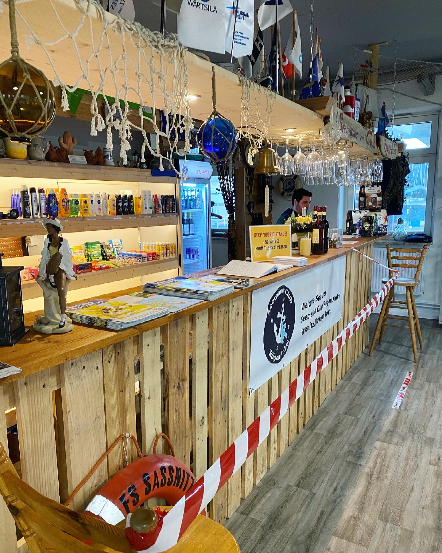 Due to COVID 19 restrictions, the Club's shop may only be opened for take away of items that can be purchased on site or ordered for take away via email Sassnitz-Seemannsmission@gmx.de. Staying in the Club is unfortunately not possible.